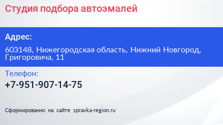 Студия подбора автоэмалей по адресу 603148, Нижегородская область, Нижний Новгород, Григоровича, 11 в дальнейшем Организация, размещена в следующих категориях: