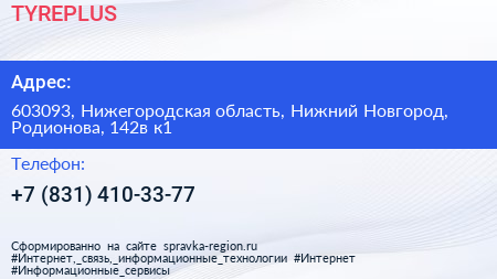 TYREPLUS по адресу 603093, Нижегородская область, Нижний Новгород, Родионова, 142в к1 в дальнейшем Организация, размещена в следующих категориях: