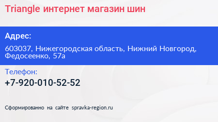 Triangle, интернет-магазин шин по адресу 603037, Нижегородская область, Нижний Новгород, Федосеенко, 57а в дальнейшем Организация, размещена в следующих категориях: