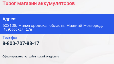 Tubor, магазин аккумуляторов по адресу 603108, Нижегородская область, Нижний Новгород, Кузбасская, 17в в дальнейшем Организация, размещена в следующих категориях: