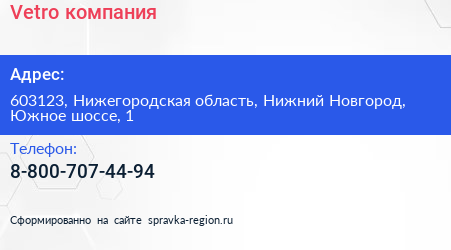 Vetro, компания по адресу 603123, Нижегородская область, Нижний Новгород, Южное шоссе, 1 в дальнейшем Организация, размещена в следующих категориях: