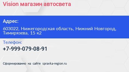 Vision, магазин автосвета по адресу 603022, Нижегородская область, Нижний Новгород, Тимирязева, 15 к2 в дальнейшем Организация, размещена в следующих категориях: