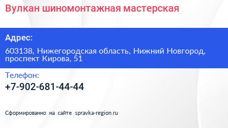 Вулкан, шиномонтажная мастерская по адресу 603138, Нижегородская область, Нижний Новгород, проспект Кирова, 51 в дальнейшем Организация, размещена в следующих категориях: