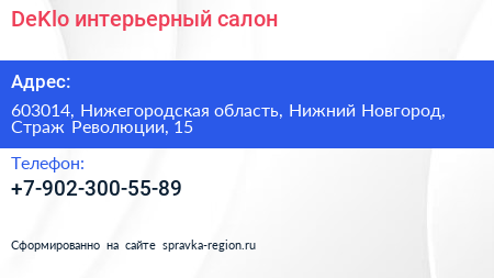 DeKlo, интерьерный салон по адресу 603014, Нижегородская область, Нижний Новгород, Страж Революции, 15 в дальнейшем Организация, размещена в следующих категориях: