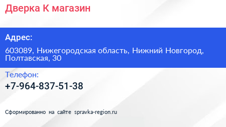 Дверка.К, магазин по адресу 603089, Нижегородская область, Нижний Новгород, Полтавская, 30 в дальнейшем Организация, размещена в следующих категориях: