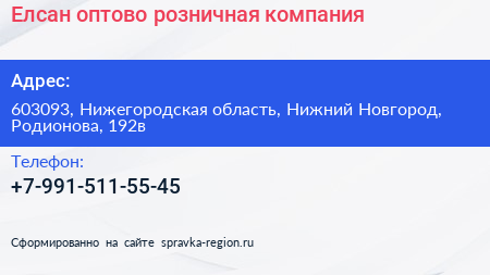 Елсан, оптово-розничная компания по адресу 603093, Нижегородская область, Нижний Новгород, Родионова, 192в в дальнейшем Организация, размещена в следующих категориях: