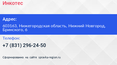 Инкотес по адресу 603163, Нижегородская область, Нижний Новгород, Бринского, 6 в дальнейшем Организация, размещена в следующих категориях: