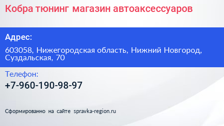 Кобра тюнинг, магазин автоаксессуаров по адресу 603058, Нижегородская область, Нижний Новгород, Суздальская, 70 в дальнейшем Организация, размещена в следующих категориях: