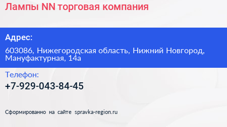 Лампы NN, торговая компания по адресу 603086, Нижегородская область, Нижний Новгород, Мануфактурная, 14а в дальнейшем Организация, размещена в следующих категориях: