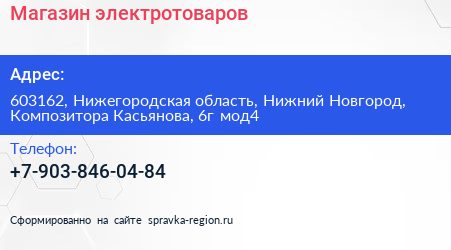 Магазин электротоваров по адресу 603162, Нижегородская область, Нижний Новгород, Композитора Касьянова, 6г мод4 в дальнейшем Организация, размещена в следующих категориях: