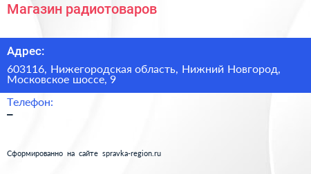Магазин радиотоваров по адресу 603116, Нижегородская область, Нижний Новгород, Московское шоссе, 9 в дальнейшем Организация, размещена в следующих категориях: