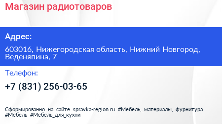 Магазин радиотоваров по адресу 603016, Нижегородская область, Нижний Новгород, Веденяпина, 7 в дальнейшем Организация, размещена в следующих категориях: