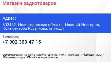 Магазин радиотоваров по адресу 603162, Нижегородская область, Нижний Новгород, Композитора Касьянова, 6г мод4 в дальнейшем Организация, размещена в следующих категориях: