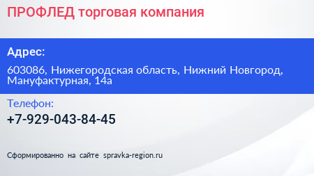 ПРОФЛЕД, торговая компания по адресу 603086, Нижегородская область, Нижний Новгород, Мануфактурная, 14а в дальнейшем Организация, размещена в следующих категориях: