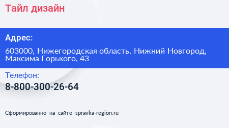 Тайл дизайн по адресу 603000, Нижегородская область, Нижний Новгород, Максима Горького, 43 в дальнейшем Организация, размещена в следующих категориях: