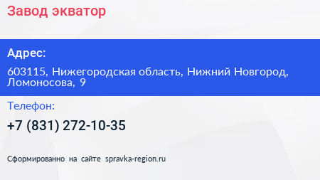 Завод экватор по адресу 603115, Нижегородская область, Нижний Новгород, Ломоносова, 9 в дальнейшем Организация, размещена в следующих категориях: