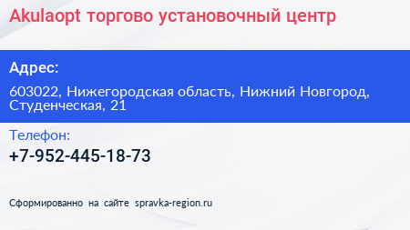Akulaopt, торгово-установочный центр по адресу 603022, Нижегородская область, Нижний Новгород, Студенческая, 21 в дальнейшем Организация, размещена в следующих категориях: