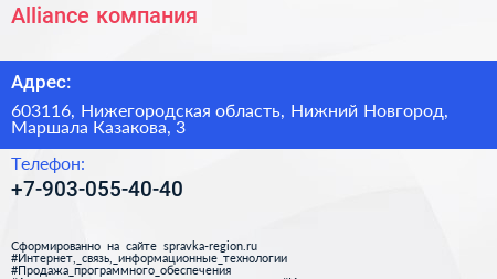 Alliance, компания по адресу 603116, Нижегородская область, Нижний Новгород, Маршала Казакова, 3 в дальнейшем Организация, размещена в следующих категориях: