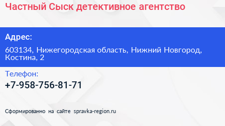 Частный Сыск, детективное агентство по адресу 603134, Нижегородская область, Нижний Новгород, Костина, 2 в дальнейшем Организация, размещена в следующих категориях:
