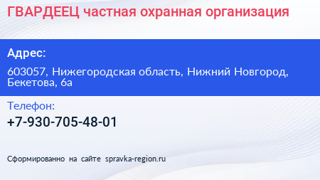 ГВАРДЕЕЦ, частная охранная организация по адресу 603057, Нижегородская область, Нижний Новгород, Бекетова, 6а в дальнейшем Организация, размещена в следующих категориях: