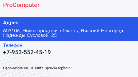 ProComputer по адресу 603106, Нижегородская область, Нижний Новгород, Надежды Сусловой, 25 в дальнейшем Организация, размещена в следующих категориях: