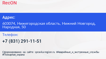 RecON по адресу 603074, Нижегородская область, Нижний Новгород, Народная, 50 в дальнейшем Организация, размещена в следующих категориях: