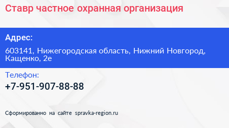 Ставр, частное охранная организация по адресу 603141, Нижегородская область, Нижний Новгород, Кащенко, 2е в дальнейшем Организация, размещена в следующих категориях: