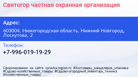 Святогор, частная охранная организация по адресу 603004, Нижегородская область, Нижний Новгород, Лоскутова, 2 в дальнейшем Организация, размещена в следующих категориях: