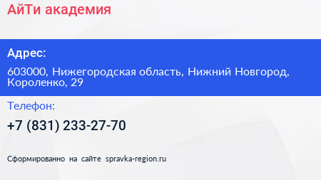 АйТи, академия по адресу 603000, Нижегородская область, Нижний Новгород, Короленко, 29 в дальнейшем Организация, размещена в следующих категориях: