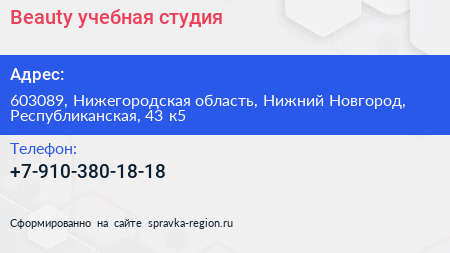 Beauty, учебная студия по адресу 603089, Нижегородская область, Нижний Новгород, Республиканская, 43 к5 в дальнейшем Организация, размещена в следующих категориях:
