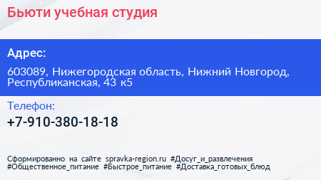 Бьюти, учебная студия по адресу 603089, Нижегородская область, Нижний Новгород, Республиканская, 43 к5 в дальнейшем Организация, размещена в следующих категориях: