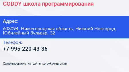 CODDY, школа программирования по адресу 603094, Нижегородская область, Нижний Новгород, Юбилейный бульвар, 32 в дальнейшем Организация, размещена в следующих категориях: