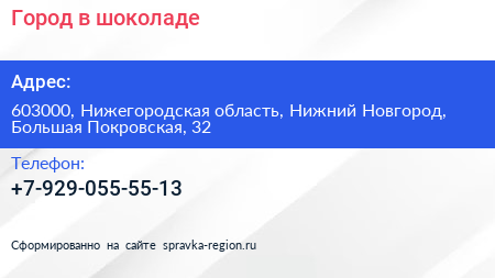 Город в шоколаде по адресу 603000, Нижегородская область, Нижний Новгород, Большая Покровская, 32 в дальнейшем Организация, размещена в следующих категориях:
