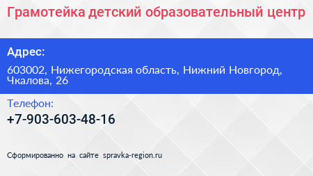 Грамотейка, детский образовательный центр по адресу 603002, Нижегородская область, Нижний Новгород, Чкалова, 26 в дальнейшем Организация, размещена в следующих категориях: