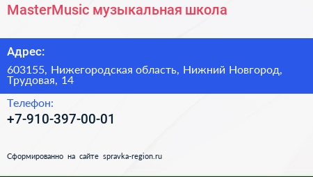 MasterMusic, музыкальная школа по адресу 603155, Нижегородская область, Нижний Новгород, Трудовая, 14 в дальнейшем Организация, размещена в следующих категориях: