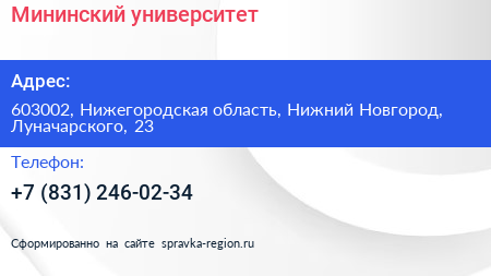 Мининский университет по адресу 603002, Нижегородская область, Нижний Новгород, Луначарского, 23 в дальнейшем Организация, размещена в следующих категориях:
