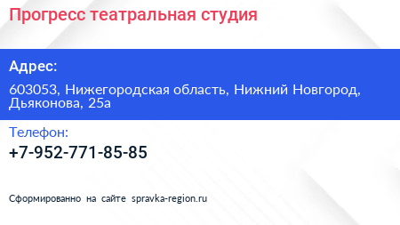 Прогресс, театральная студия по адресу 603053, Нижегородская область, Нижний Новгород, Дьяконова, 25а в дальнейшем Организация, размещена в следующих категориях: