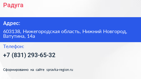 Радуга по адресу 603138, Нижегородская область, Нижний Новгород, Ватутина, 14а в дальнейшем Организация, размещена в следующих категориях: