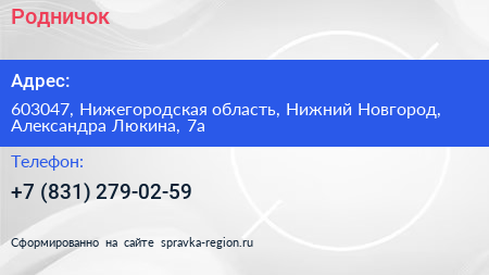 Родничок по адресу 603047, Нижегородская область, Нижний Новгород, Александра Люкина, 7а в дальнейшем Организация, размещена в следующих категориях: