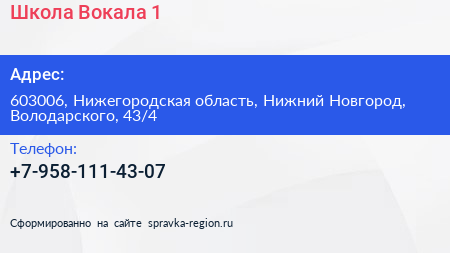 Школа Вокала №1 по адресу 603006, Нижегородская область, Нижний Новгород, Володарского, 43/4 в дальнейшем Организация, размещена в следующих категориях: