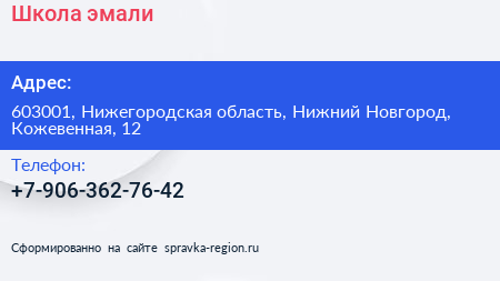 Школа эмали по адресу 603001, Нижегородская область, Нижний Новгород, Кожевенная, 12 в дальнейшем Организация, размещена в следующих категориях: