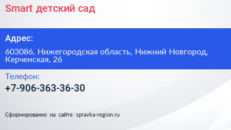 Smart, детский сад по адресу 603086, Нижегородская область, Нижний Новгород, Керченская, 26 в дальнейшем Организация, размещена в следующих категориях: