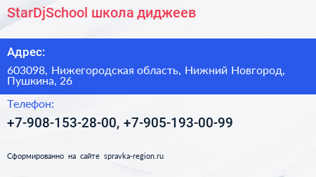 StarDjSchool, школа диджеев по адресу 603098, Нижегородская область, Нижний Новгород, Пушкина, 26 в дальнейшем Организация, размещена в следующих категориях: