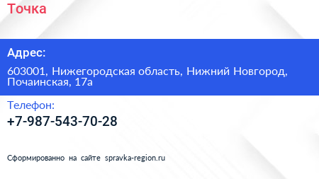 Точка по адресу 603001, Нижегородская область, Нижний Новгород, Почаинская, 17а в дальнейшем Организация, размещена в следующих категориях: