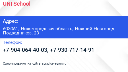 UNI School по адресу 603061, Нижегородская область, Нижний Новгород, Подводников, 23 в дальнейшем Организация, размещена в следующих категориях: