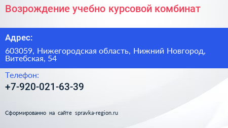 Возрождение, учебно-курсовой комбинат по адресу 603059, Нижегородская область, Нижний Новгород, Витебская, 54 в дальнейшем Организация, размещена в следующих категориях: