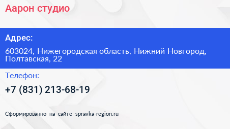 Аарон студио по адресу 603024, Нижегородская область, Нижний Новгород, Полтавская, 22 в дальнейшем Организация, размещена в следующих категориях: