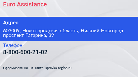 Euro Assistance по адресу 603009, Нижегородская область, Нижний Новгород, проспект Гагарина, 39 в дальнейшем Организация, размещена в следующих категориях: