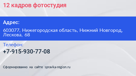 12 кадров, фотостудия по адресу 603077, Нижегородская область, Нижний Новгород, Лескова, 68 в дальнейшем Организация, размещена в следующих категориях: