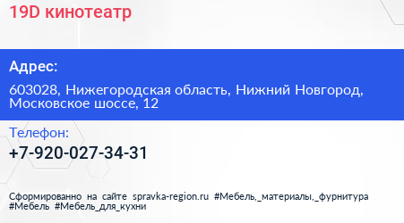 19D кинотеатр по адресу 603028, Нижегородская область, Нижний Новгород, Московское шоссе, 12 в дальнейшем Организация, размещена в следующих категориях: